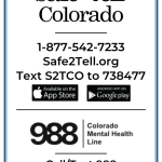 House Bill 22-1052 requires each student identification card issued to a public school student to contain the phone number, website, and text talk number for the 24-hour telephone crisis service center (988 Colorado Mental Health Line) and Safe2Tell.